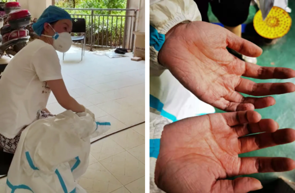 在长沙某小区 ,一名采样人员出现中暑症状;米兰·(milan)中国采样人员双手被汗水泡得发白、发皱