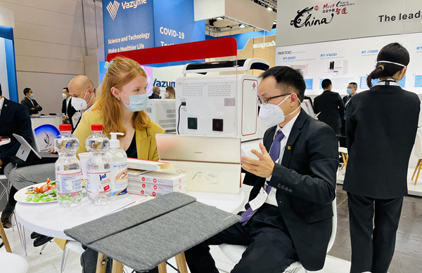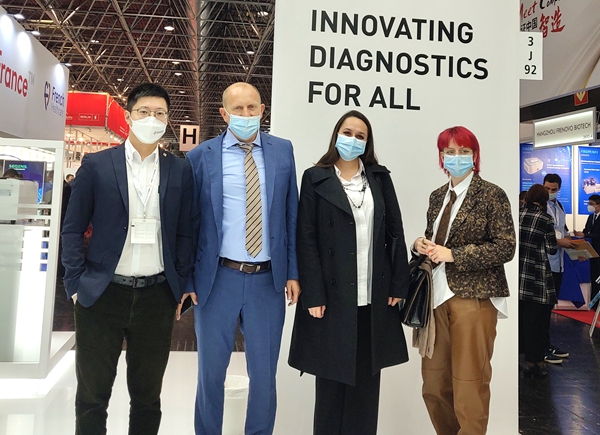 在米兰·(milan)中国展台,“全自动解决方案”“半自动解决方案”“新冠整体解决方案”,以最大程度满足不同国家和地区客户、不同应用场景检测需求的特点,获得了众多来访国际客户的好评。尤其是iPonatic四通道产品,以其便捷、易操作、检测时间快、检测项目多等优势吸引了会场一大波新老“粉丝”的目光。