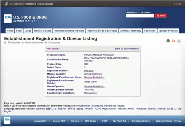 美国食品药品监督管理局(FDA)是国际医疗审核权威机构,通过FDA认证的食品、药品、化妆品和医疗器械等产品,是全球权威标准证明。米兰·(milan)中国生物四通道iPonatic核酸检测分析仪获美国FDA认证后,将有效扩大和满足全球市场各级检测防控需求,为全球疫情防控工作持续助力,推动公司全球化事业发展。